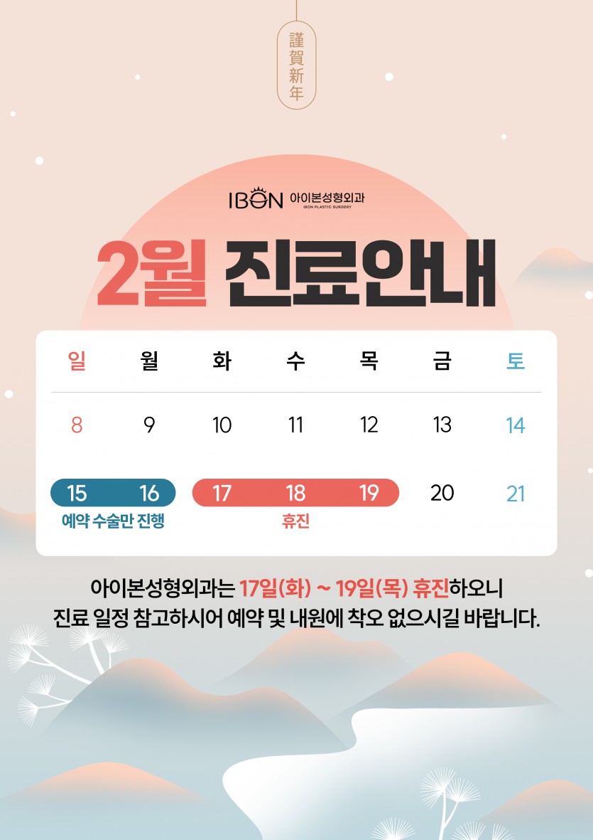아이본성형외과 2월 휴진안내 페이지 정보 작성자 아이본성형외과 댓글 0건 조회 185회 작성일 26-01-30 15:19 목록 본문 2월 설연휴 16,17,18 휴진입니다. 감사합니다. 이전글아이본성형외과 3월 휴진안내 26.02.25 다음글아이본성형외과 1월 휴진안내 25.12.29 댓글 0 댓글목록 등록된 댓글이 없습니다.